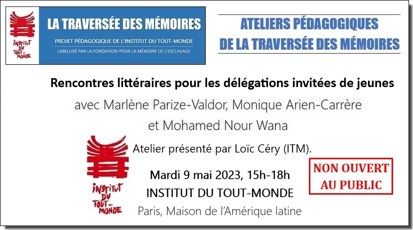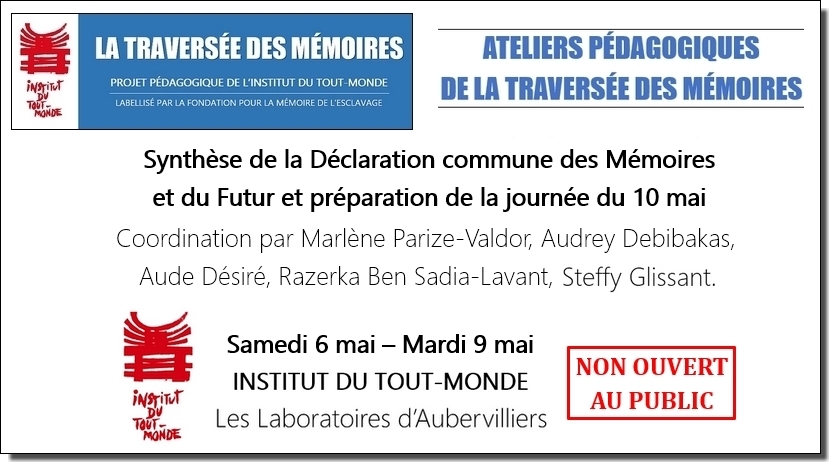 En amont de cette journée du 10 mai, l’Institut du Tout-Monde mènera avec les délégations invitées de jeunes et avec leurs enseignants, une série d’ateliers pédagogiques. Ces ateliers seront dévolus à la préparation des trois cérémonies, à l’établissement de la Déclaration commune des Mémoires et du Futur (à partir des contributions écrites par les élèves et étudiants tout au long du processus de La Traversée des Mémoires), et à des rencontres littéraires. CES ATELIERS PÉDAGOGIQUES NE SONT PAS OUVERTS AU PUBLIC, mais le troisième d’entre eux (Rencontres littéraires) sera enregistré et par la suite mis en ligne sur le site de l’ITM.